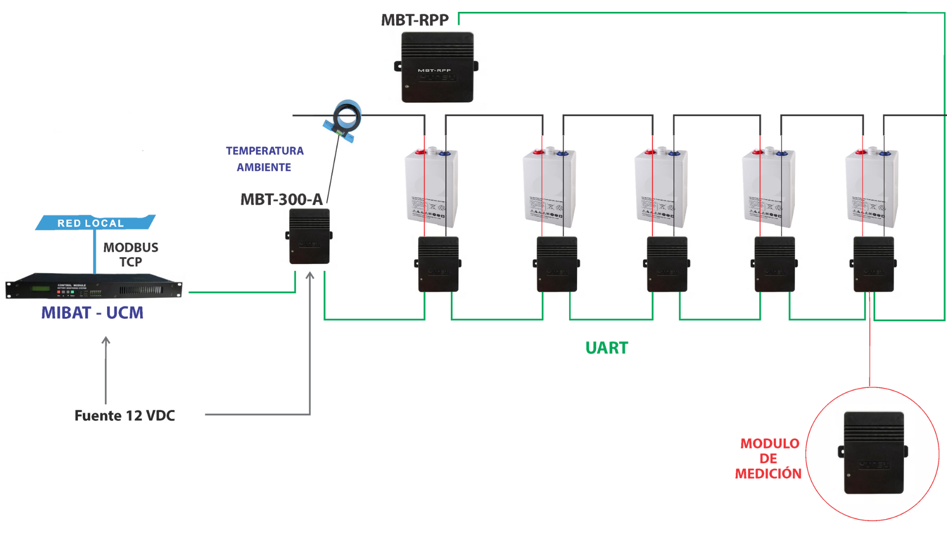El sistema MIBAT™ está diseñado específicamente para la medición de baterías estacionarias de 1.2 V, 2 V, 6 V y 12 V, utilizando tecnología avanzada patentada para el monitoreo más completo de la industria, permitiendo su integración vía protocolo Modbus/TCP hacia sistemas externos de monitoreo (PLC / HMI / SCADA).