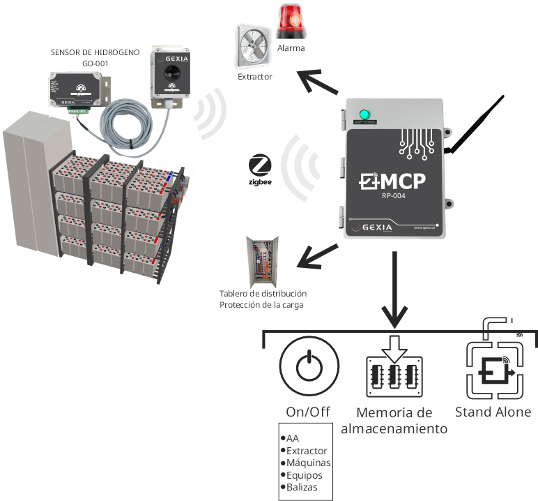Se comunica con el sensor de hidrógeno (y otros sensores) inalámbricamente por protocolo Zigbee y hace la lógica necesaria para el apagado o encendido de los elementos de extractores y alarmas visuales y auditivas.